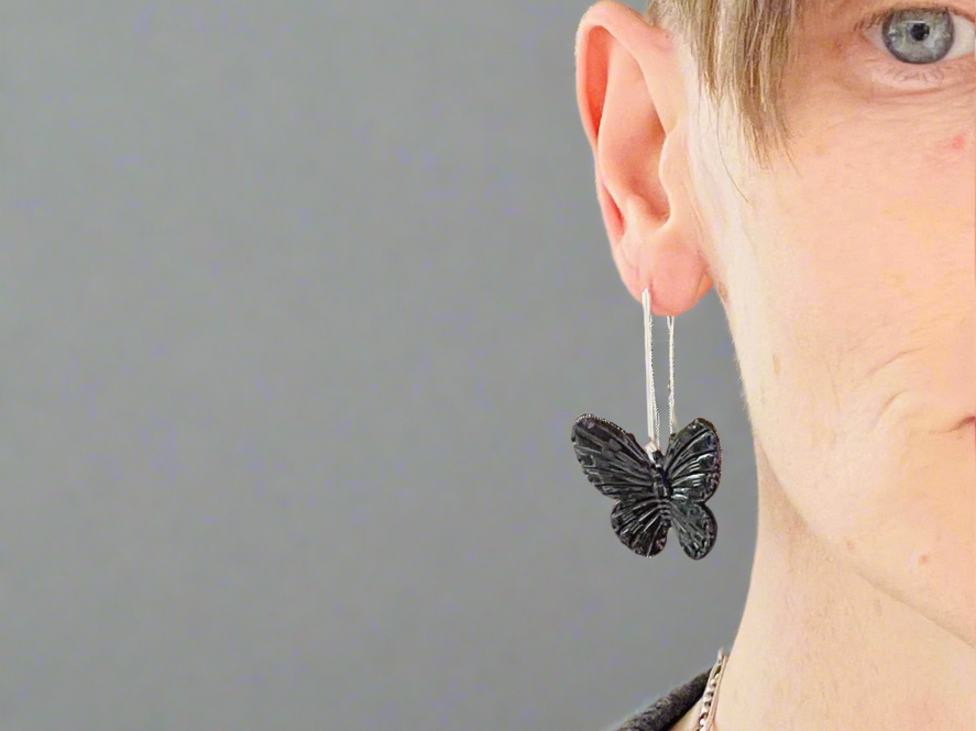 ONE PAIR LEFT: 1980s West German acrylic butterfly pendant earrings - black